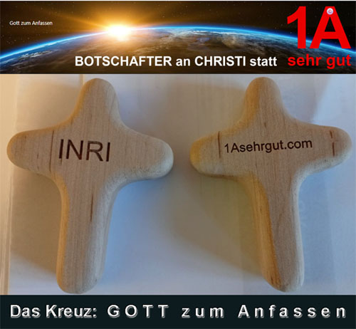 Abgerundetes Kreuz in die rechte Hand nehmen, oberes Ende zwischen Zeigefinger und Mittelfinger. Faust schließen und damit Kreuz fest umklammern. Dann haben Sie Gott zum Anfassen in Ihrer rechten Hand!