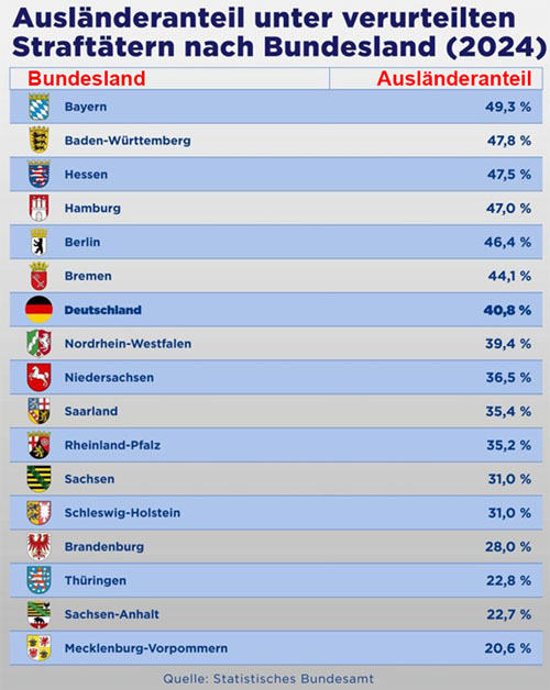 In der nachfolgenden Statistik vom statistischen Bundesamt liegt der Ausländeranteil unter den verurteilten Straftätern bei den 17 Bundesländern (2024) zwischen 20.6 % und 49,3 %. Deutschlandweit sind es 40,8 %.